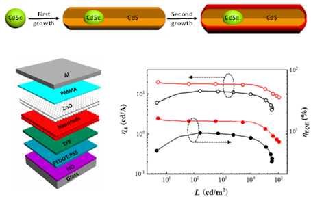 Next, shape anisotropic QDs have polarized light emission andhigh molar extinction coefficient different from the traditional spherical QDs, so we developed a two-step method to grow a thick rod-shape CdS shell onto CdSe core. The successful overgrowth of an additional CdS shell over the CdSe/CdS NRs led to the increase of PL quantum efficiencies up to 86%. The high maximum luminance and EQE can reach up to 104000 cd/m2and 15.7%. These exceptional values are at least 1.3-fold higher as compared to the highest values of luminance of 76000 cd/m2and EQE of 12% reported to date. Such excellent results are likely attributable to a unique structure in CdSe/CdS//CdS NRs with a relatively high QYs and thick CdS outer shell that minimizes nonradiative energy transfer between closely packed EML NRs. Optics Express, 2019, 27(6), 7935-7944.(SCI, IF=3.98).