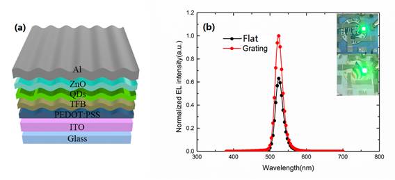 Figure(a)Schematic of flat and grating device structure of QLED in this work.(b)Normalized EL spectra. The insets depict the photographs of the fabricated QLED.