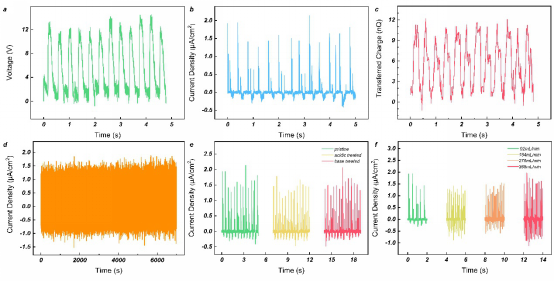 Figure 2. The output performance of WD-TENG: output voltage (a) and current density (b) and transfer charge (c); (d) WD-TENG stability test; (e) acid and alkali resistance stability test; ( f) Self-driving flow meter based on WD-TENG.