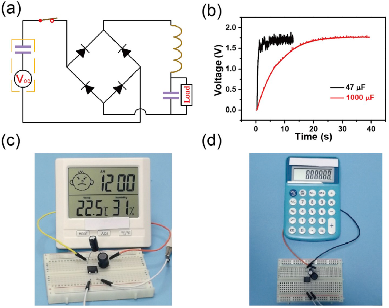 Fig. 4. Demonstration of the passive power management circuit for driving electronics. (a) Circuit diagram of the passive power management circuit for driving electronics. (b) Voltage curve when using the passive power management circuit with different capacitors to drive the temperature hygrometer. (c) Photograph of the normal work of the temperature hygrometer driven by the passive power management circuit. (d) Photograph of the normal work of the calculator driven by the passive power management circuit.