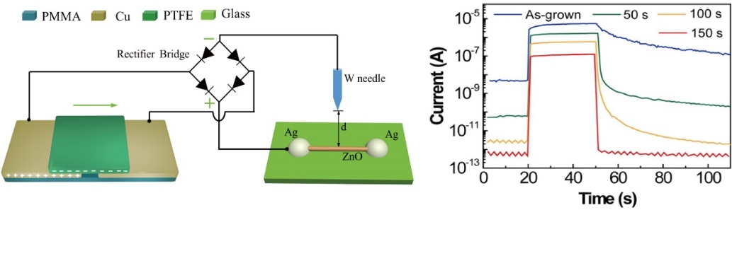 (a) Schematic diagram of the surface passivation system based on TENG. (b) Single-cycle time-resolved photocurrent curves of the single ZnO nanowire after different surface passivation time of 50, 100, and 150 s, respectively.