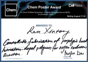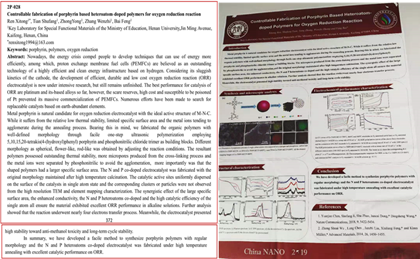 8月19日-21日,第八届中国国际纳米科学技术大会(ChinaNANO 2019)在北京国际会议中心召开。iQQTV 特种功能材料重点实验室白锋教授课题组硕士研究生任希彤的墙报“Controllable Fabrication of Porphyrin Based Heteroatom-doped Polymers for Oxygen Reduction Reaction”荣获第二分会“最佳Poster奖”。Poster主要涉及一种卟啉基聚合物材料的可控制备方法及其相关电催化性能的研究,为高温形貌保持的卟啉基电催化材料提供了一种新的思路。该项研究得到了iQQTV 研究生“英才计划”的资助。