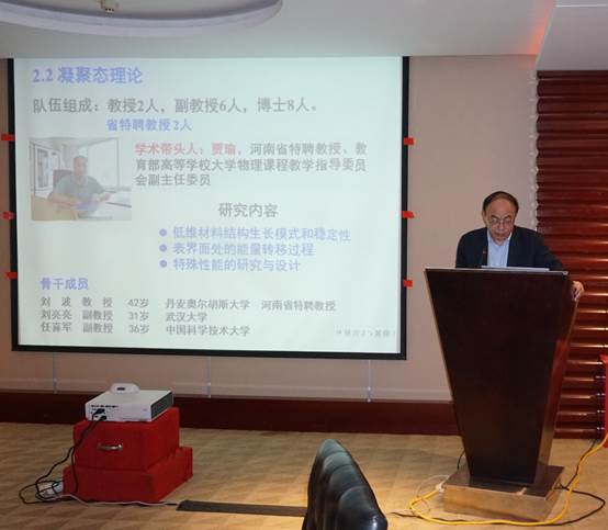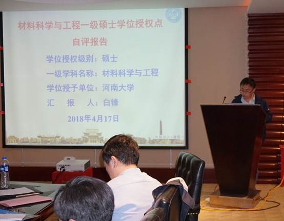 特种功能材料重点实验室、物理与电子学院共为物理学博士、硕士点培养单位,物理与电子学院院长顾玉宗代表物理学学位点作自评报告。特种功能材料重点实验室副主任白锋代表材料科学与工程学位点作自评报告。首先,两人对本学科的发展历史与现状,主要学科方向的特色、优势及发展前景作了简要概述;随后,按照《评估指标体系》3个一级指标和17个二级指标,逐项汇报了培养目标、学位标准、师资队伍、科学研究、人才培养等方面的具体情况;最后,分析了本学位点存在的问题和不足,提出了改进提升计划。