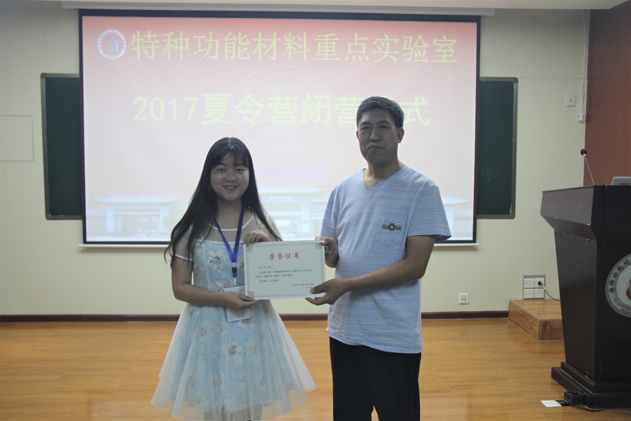 ,了解特种功能材料重点实验室,热爱学习,热衷科研,能激起同学们的科研热情和兴趣,并希望明年在研究生复试中能再见到大家。营员代表们表示一周来的学习和生活,彼此间结下了深厚的友谊,通过老师们深入浅出的介绍,对自己的学习有了更进一步的了解,在人生的一个关键节点上,老师们用各自丰富的学识、真诚的态度、以及自身的经历给自己上了难忘的一课,也更加明确了自己未来的发展规划。同学们感谢为夏令营付出的所有老师和师兄师姐,相约明年一并考入实验室。实验室常务副主任杜祖亮教授为每位营员颁发了结业证书,省特聘教授武四新教授为获得优秀营员的同学颁发了优秀营员证书。