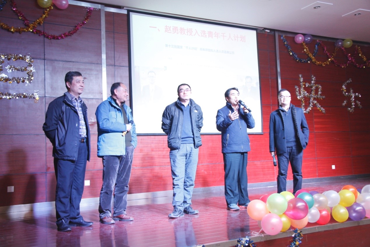 杜祖亮教授首先为元旦联欢会致辞。他对实验室在2016年取得的累累硕果进行了点评,充分肯定了实验室全体师生的辛勤劳动,鼓舞激励大家齐心协力再创辉煌。随后,杜主任为大家介绍了2016年加入实验室的张霖书记、理论物理大家贾瑜教授、自美国访学归国的程纲教授、赵勇教授、孔令刚副书记。他指出,这些人才的引进为实验室注入了新鲜的血液,必将带领实验室走上辉煌发展的康庄大道。上述人员分别为实验室送上祝福,并饱含热情地演唱了《北京的金山上》。随后,实验室全体老师集体上台演唱,以一首寓意深刻的《团结就是力量》把联欢会的气氛推向高潮。台上慷慨激昂,台下掌声如雷,充分展现了实验室欢乐一家人的和谐氛围。