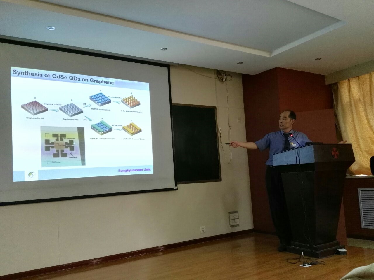 8月24日,应特种功能材料重点实验室邀请,韩国成均馆大学化学系教授,理学院院长Kwon Young-Uk教授来我实验室进行学术交流,并做了以“超声合成燃料催化剂和介孔材料的合成及应用”为主题的学术报告。本次报告由Kwon教授的博士毕业生,刘景玲老师主持,特种功能材料重点实验室相关老师和学生参加了此次报告会。