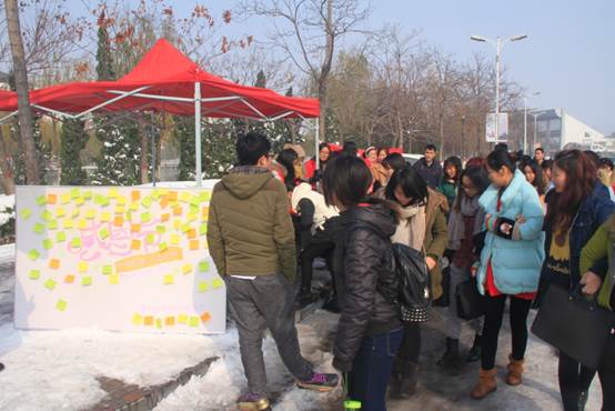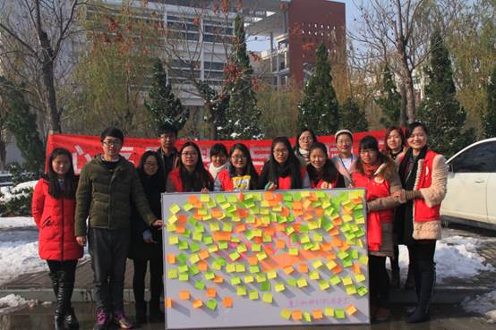 本次活动分为线上活动与线下活动两个部分,形式新颖,内容丰富。线上活动于11月24日开始进行,以“心存感恩,与爱同行”为话题,借助重点科研机构团委官方微博、微信平台,发动同学转发置顶微博并@三位好友,说出感恩话语。同学们表现出极大的热情,据统计,此条微博阅读量达10000余次,收到各类感恩祝福上千份。线下活动11月26日上午在创业中心门口举行。寒冷的天气并未阻挡同学们表达感恩的热情,纷纷攘攘的路人主动上前将自己的心里话写在“感恩便利贴”上并贴在祝福展板上。活动宣传横幅上也留满了签名,以此铭记这些感动的瞬间。此外,为了让更多的师生关注重点科研机构团委官方微博、官方微信,我们还将官微二维码贴在活动现场,凡关注我们的师生均可参与抽奖,奖品不大,却浓浓的都是爱意。