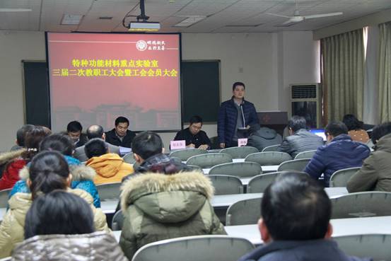 2015年1月8日下午,在雄壮的国歌声中,特种功能材料重点实验室三届二次教职工暨工会会员大会在实验室二楼报告厅隆重举行。特种功能材料重点实验室全体领导和教职工参加了会议,大会分为工作报告和分组讨论审议报告两个阶段。会议分别由实验室副主任白峰教授和实验室工会主席、副主任胡彬彬主持。