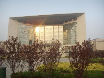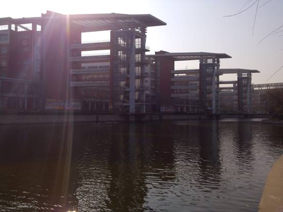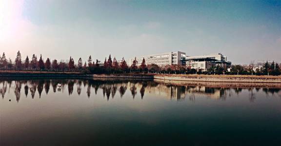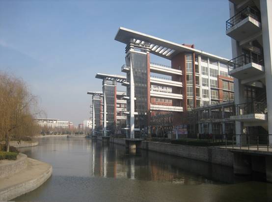 :校园中的教学楼与实验楼矗立在弯弯曲曲的水面旁边,即具有江南水乡的古典风貌,又具有现代校园的建筑魅力。
