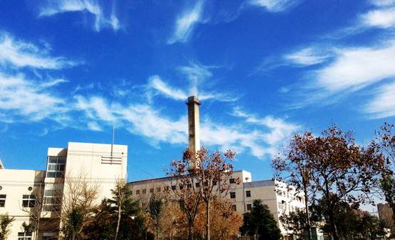 金明校区北苑附近,湛蓝的天空,漂浮着一缕缕的白云,画面的中央,一杆笔直的烟囱树立,烟囱的附近漂浮着白云,白云像是从烟囱中飘出来的一样。