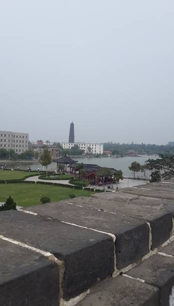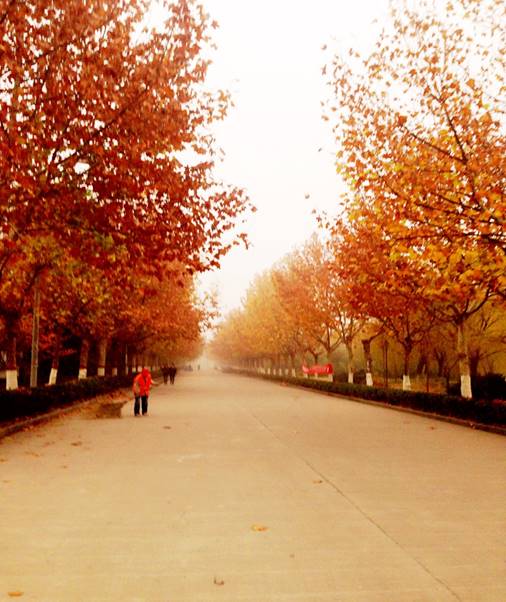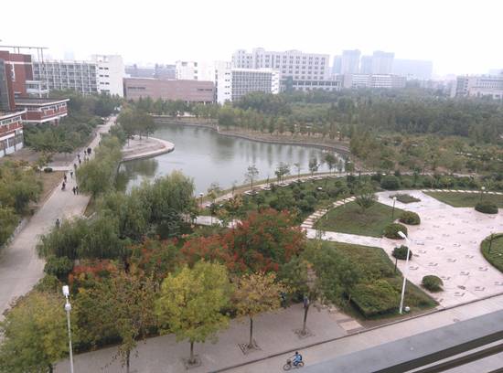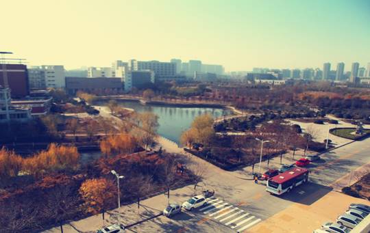 :这是新校区北面的局部鸟瞰图。天空是悠远的浅蓝,日光也很明亮,把即将驶离的校车的影子拉得很长。在寂静校园里,已是晚秋了。你看,大路两旁有的树木早已干脆地把树叶落尽,唯有那湖岸旁的柳枝还依然挂着成熟的金黄,让整个暗淡的画面多了一丝明亮。这不正是而今的河大吗?百年的风雨砺磨后,不事浮华,着一份淡远的真实,深沉而又明媚着。我的梦,河大人的梦。