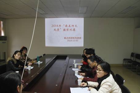 为了落实学校党委宣传部、校团委“关于“最美河大风景”摄影比赛的通知”要求,激励广大研究生更加积极的参与学校活动,重点科研机构团委于12月30日下午在特种功能材料重点实验室三楼报告厅举行“最美河大风景”摄影比赛预选赛。本次预选赛共收到44人的近百张参赛作品。六位评委分别来自特种功能材料重点实验室、黄河文明与可持续发展研究中心、天然药物与免疫重点实验室的师生,预选赛的整个工作由重点科研机构团委负责人邹雪艳主持。