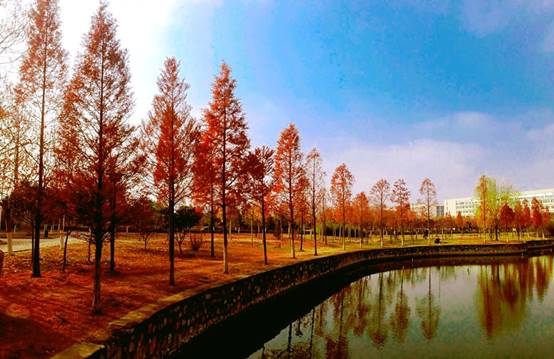 金明校区雪垠湖畔,笔直耸立的杉树如庄严的守卫挺立在湖边,由近及远,杉树则由高到低的排列着,清澈的湖水,映照出红棕色杉树的倒影。