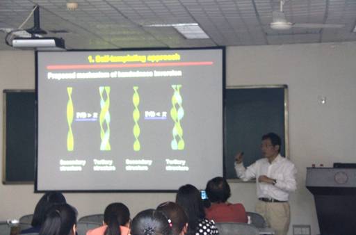 杨永刚教授介绍了手性材料的合成方法及其在手性药物分离和不对称催化方面的应用。以手性超分子自组装体为模板,合成了一系列的手性聚倍半硅氧烷和手性碳材料,通过圆二色谱表征和理论计算模拟相结合的方法,证明了其在分子水平上的手性。杨教授深入研究了手性材料的形成过程,探索手性材料合成中的一些基础问题,并通过实验条件的控制,实现对单一手性的控制以及手性的反转。报告通过形象的模型模拟,深入浅出的讲解,使参加报告会的师生受益匪浅。 杨永刚教授还与在座师生进行了互动交流与讨论,并回答了师生提出的相关提问。 杨永刚,男,教授,博士生导师。1993年吉林大学化学系本科毕业,1996年吉林大学理论化学研究所获硕士学位,1999年中科院上海有机化学研究所博士研究生毕业,获博士学位,2001年至2006相继在法国Laboratoire Hétérochimie Moléculaire et Macromoléculaire(UMR-CNRS 5076),ENSCM,日本奈良先端科技大学院大学和日本信州大学作博士后。2006年9月至今,为苏州大学材料与化学化工学部高分子化学与物理专业博士生导师,手性化学实验室主任。主要研究方向为:超分子组装和单手螺旋纳米结构的控制与应用, 2004年以来文章发表在J. Am. Chem. Soc.、Angew. Chem.、Chem. Commun.、Chem. Mater.等杂志上,2008年入选教育部 “新世纪人才”,2012年入选苏州大学“东吴学者”。 (新闻作者:吴丽敏)