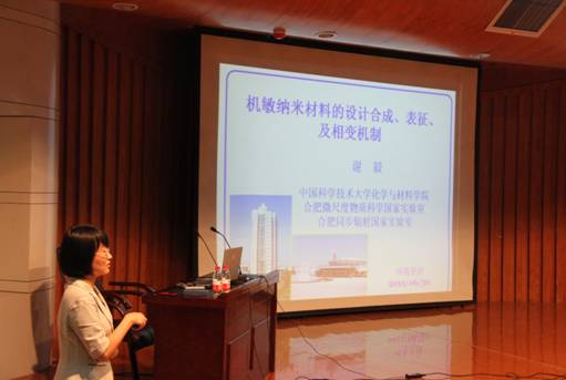 谢毅教授从机敏材料的背景及最新发展谈起,介绍了VO2这种最具有应用前景的红外智能材料在国内外的相关研究情况。并着重就她们课题组在M相VO2新的合成方法,利用XAFS(同步辐射谱)研究VO2金属-绝缘体转变的动力学过程,几种新型钒氧化物的合成,纳米尺度钒金属氧化物的金属-绝缘体转变研究等四个方面所开展的研究工作向大家做了介绍。此外,谢教授还就机敏材料的应用及纳米尺度下金属-绝缘体相变表征手段等问题和实验室的师生进行了深入的探讨和交流。