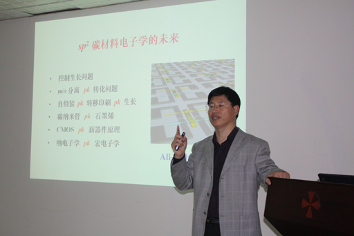 刘教授简要概述了石墨、金刚石、C60、碳纳米管和石墨烯等碳材料的性质及国际上该领域的发展历史和最近的研究状况,指出碳材料的研究将是未来一段时间内极其重要的研究方向。他具体以碳纳米管的克隆生长和切割石墨烯做电极形成全碳集成电路等为例,说明了国内外在碳材料手性控制生长、冻化、手性分离、器件加工与组装等方面的研究方法,并详细分析了它们在应用方面面临的诸多机遇和挑战。站在该领域的国际最前沿,刘教授介绍了自己带领的团队在该领域的研究思路、工作方法、及研究成果,并结合今后一段时间内国家的科技发展规划,指出该领域为化学家们提供了一个良好的发展机遇,鼓励老师和同学们努力工作,取得好的成果。报告会后,刘教授就在场师生提出的相关问题作了详细解答和深入的交流。整场报告深入浅出,使与会师生对sp2碳材料电子学有了较为详细而客观的了解。