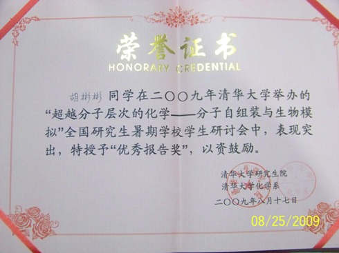 根据暑期学校的安排,具有两名学员(含)以上的单位要选出一位代表进行研究生报告讨论会。共有约40名同学报告各自的工作,由5位清华大学的授课老师组成评审团,从中选出11名优秀报告奖。实验室的胡彬彬博士作了报告,赢得了较好的评价,并荣获了2009年全国研究生“超越分子层次的化学-分子自组装与生物模拟”暑期学校“优秀报告奖”。
