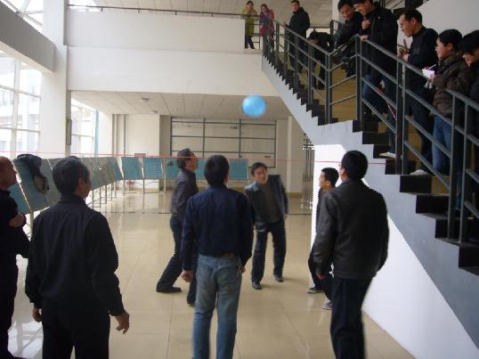 活动内容分为分组对抗赛和趣味活动两大类。在对抗赛中,所有教工分成三个小组,进行“跳绳、顶气球、乒乓球”三个项目的比赛。每项比赛每组派四名选手参加,每人只能参加一个项目的比赛。下午2点30分,全体教工在一楼大厅汇集,首先是跳绳对抗赛,接下来是最激烈的顶气球比赛和乒乓球对抗赛。随后是趣味活动项目时间,有的老师去猜谜语,有的老师去参加套圈,有的老师去掷乒乓球,有的老师去参加摸鼻子的活动,个个玩得不亦乐乎,直到活动结束仍兴趣怏然。