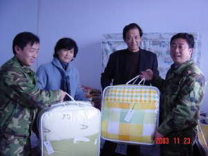 工程中心的工作时刻牵动着校领导的心,校长关爱和教授、副校长黄亚彬教授曾分别亲临工地指导,并多次打电话询问工程进行情况。特别是入冬以来,校领导从设备实验处得知工地因缺乏取暖设备、生活条件比较艰苦后,十分焦急,专门委托设备实验处采取措施,想方设法解决取暖及生活问题。11月23日上午,受关校长委托刚从省城结束会议归来的副校长黄亚彬教授没顾上休息即在设备实验处处长赵瑾教授、副处长汪国安等陪同下,亲临济源工程中心看望那里的工作人员。一下车,黄校长直奔车间嘘寒问暖,询问生产、生活情况,并亲手把学校购买的被褥等防寒取暖物资发放到每个人手里。当师生从黄校长手中接到慰问物品后,十分高兴。表示决不辜负校领导的期望和关爱,努力工作,克服困难,把纳米材料科学技术工程中心建成一流的工程中心,为河大的腾飞和河南省经济发展做出贡献。