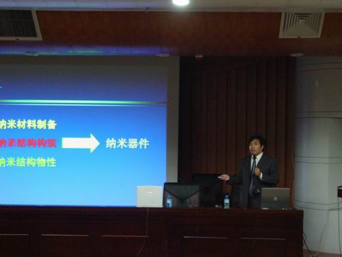 首先,特聘教授和博导们结合各自的研究方向,分别就纳米材料与纳米结构、纳米材料制备及应用、纳米摩擦学前沿研究、有机功能材料、纳米结构材料合成及组装、半导体纳米功能材料、半导体纳米掺杂材料、凝聚态物理理论研究以及光催化在环境中的应用等等方向向大家报告了纳米科学与技术最前沿的研究进展和现状,以及他们各自的研究内容,并鼓励大家向科学难题挑战,为增强我们国家的科技发展水平做出青年人应有的贡献。教授们精彩的报告不时赢得同学们的阵阵掌声。