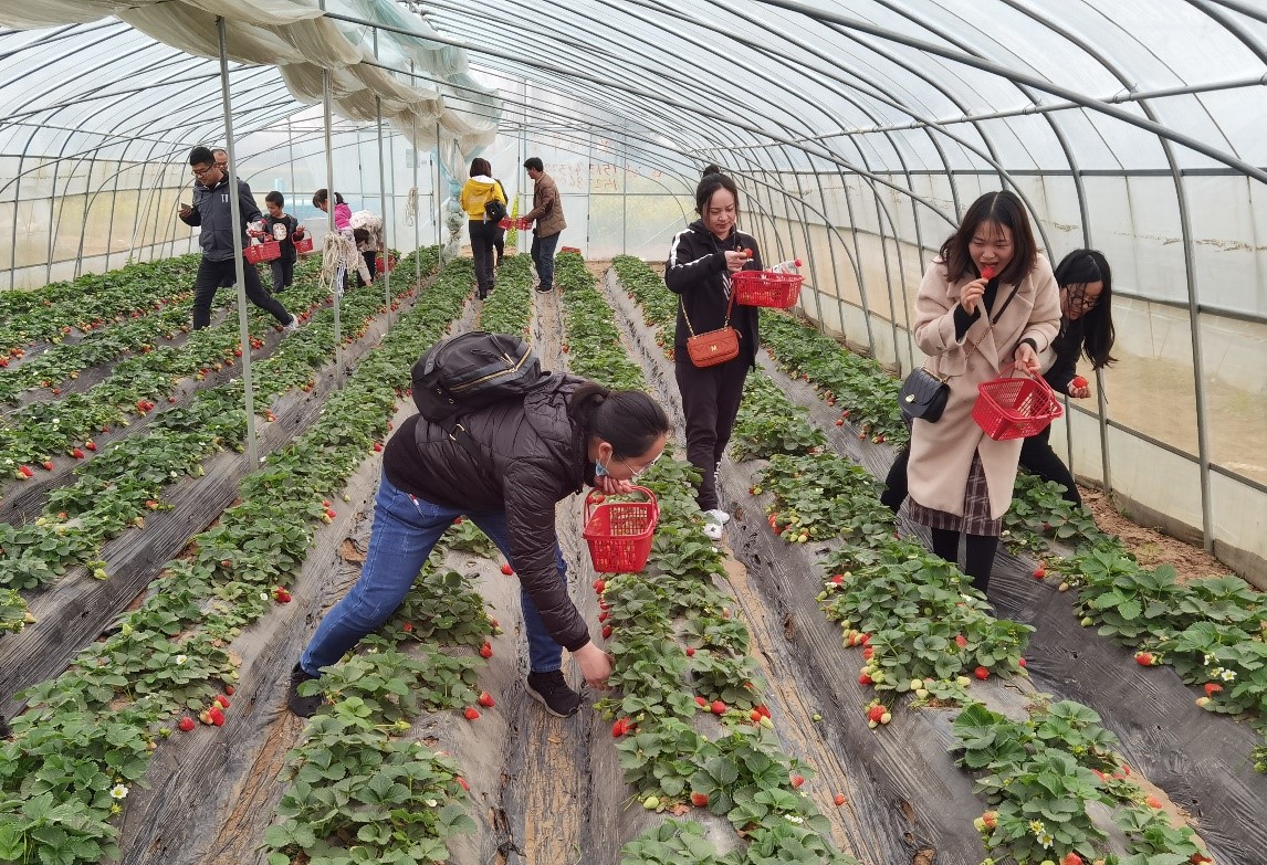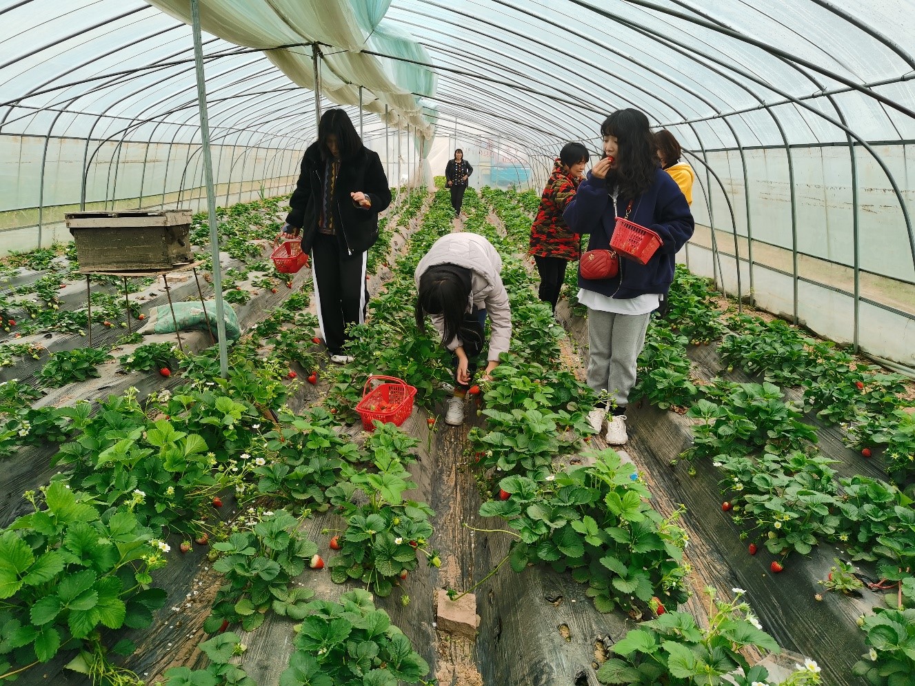上午10点钟,材料学院女教工及其家属、以及为本次活动服务的青年男教师等40余人在工会的精心组织下顺利到达了中牟现代农业草莓采摘园,开启了欢快的草莓和生菜采摘。为了能让每个人都能采摘到满意的草莓,一共分了三个大棚开始采摘。大里一颗颗红艳艳的草莓,很是惹人喜爱。大家一手领着篮子一边探下身子小心的摘下,有时也忍不住吃上几颗,尤其是当尝到了与众不同的好味道时还不忘发出“啧啧”地称赞声。除了草莓,大棚里绿油油的生菜也受到了大家的青睐,有的草莓还没摘完就跑去挖生菜,很快一个棚里的生菜都被“洗劫而空”,篮子袋子不够装了,有的直接就手里捧着抱着。很快采摘结束,大家把一篮篮一袋袋胜利的果实装上了车。随后老师们从车上拿下工具,在采摘园附近进行了“人人捡垃圾,爱护乡村”的文明志愿服务活动。最后大家乘车返回学校,在路上大家兴奋的讨论着交流着。