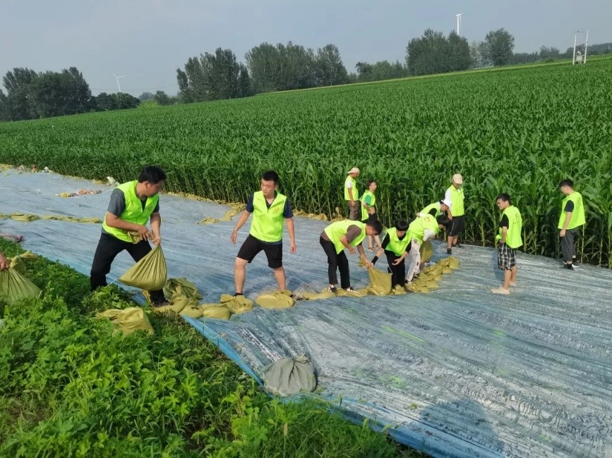 图 吴杰涛与青年突击队用沙石袋铺压防雨塑料布