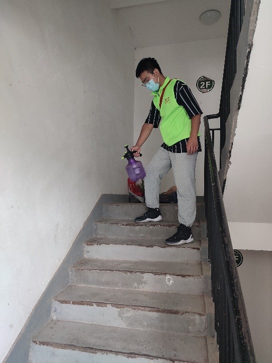 图 吴杰涛在社区内张贴防疫公告 图 吴杰涛在居民楼内进行消杀工作
