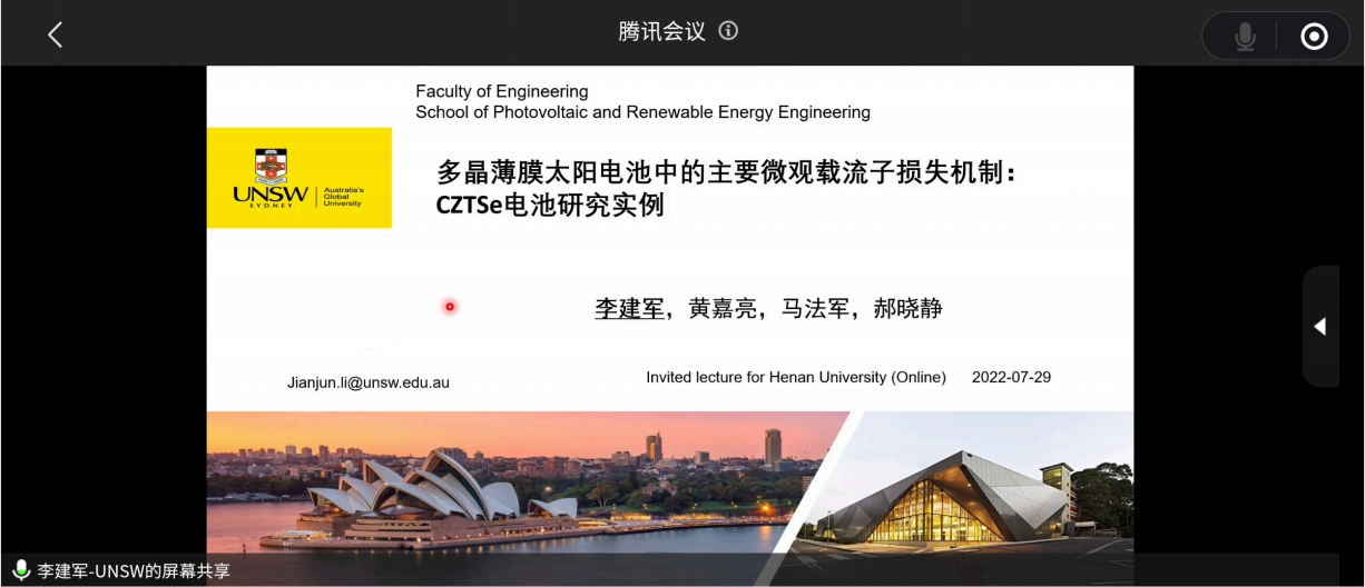 李建军老师为大家进行了题为“多晶薄膜太阳能电池中的主要微观载流子损失机制”的报告。李老师首先以效率高于12%的铜锌锡硒(CZTSe)薄膜太阳电池为例,从前后界面载流子传输与复合、带隙与电势波动、自由载流子浓度、载流子收集及晶界与晶粒内复合等方面进行分析,并结合三维器件仿真揭示了CZTSe薄膜太阳能电池中的主导复合机制,对其近年来的工作以及取得的成果进行了详细的介绍。