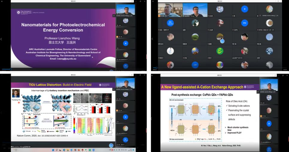 材料学院邀请,昆士兰大学王连洲教授做客海外名师大讲堂,以“Semiconductor Nanomaterials for Solar Energy Conversion”为题进行了精彩的学术讲座。材料学院白锋教授担任主持,讲座采取线上模式(腾讯会议)进行,全校相关领域百余名教师与研究生参加了此次讲座。