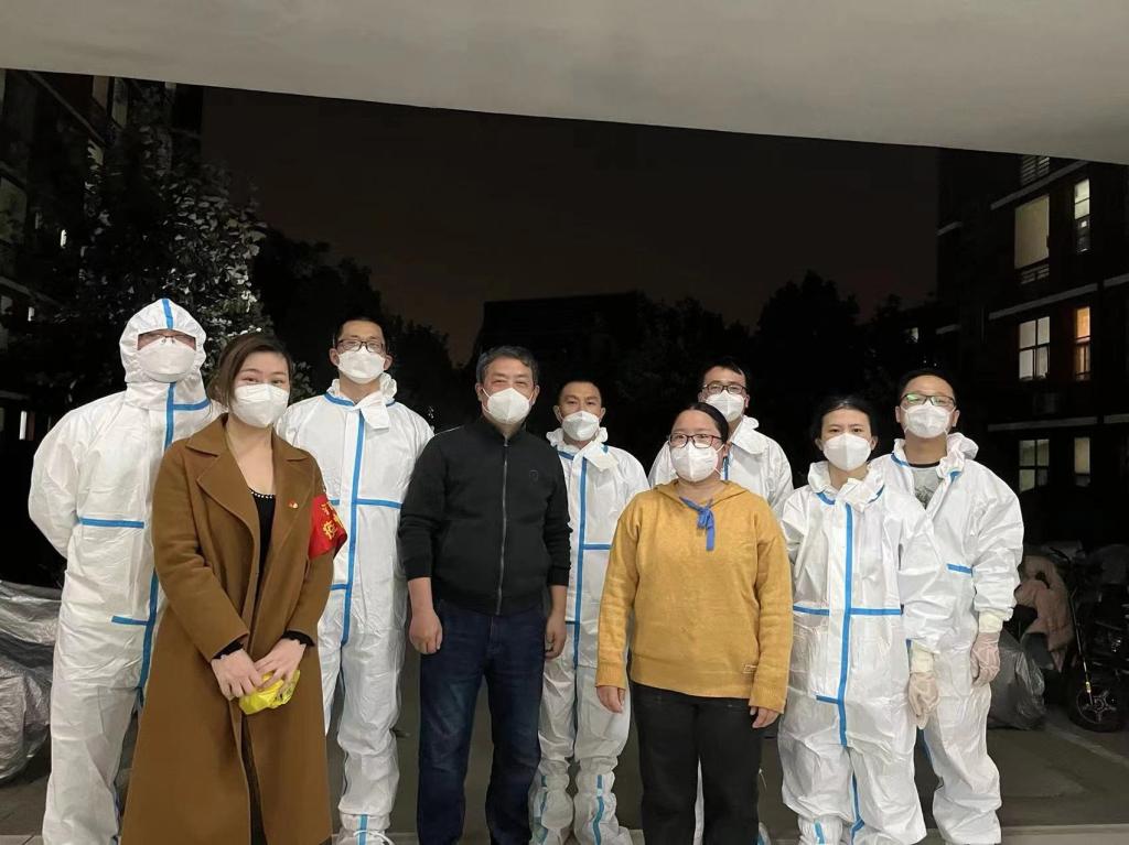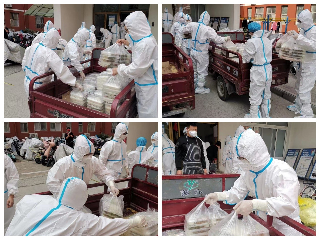 学院里奋战在抗疫一线的这些“大白”们在党委书记张霖的带领下迅速凝成一股绳,积极有序投入战斗,为同学们铸就了安全温暖的港湾。他们穿着防护服,拎着几十斤重的食物,往复在17号学生公寓的楼层间穿梭,六层楼的学生公寓,三顿饭送下来相当于每天3次负重爬20层楼的运动量,浑身湿透已成常态,密闭的防护服还会把人闷的有种窒息的感觉。在这期间,已经50多岁的张霖书记仍坚持与大家一起为同学们送餐,工作量和大家毫无差别。“一听到这些孩子被封控在宿舍就很着急,将心比心,觉得他们挺不容易的,做老师的就应该义不容辞”副书记石宇珺说。除了送餐之外,志愿者们还要处理各类紧急突发情况,给同学们采购、协调药品和需要的生活物资,积极和后勤反馈沟通协调,尽力为学生解决每一个问题,做好一切保障工作。