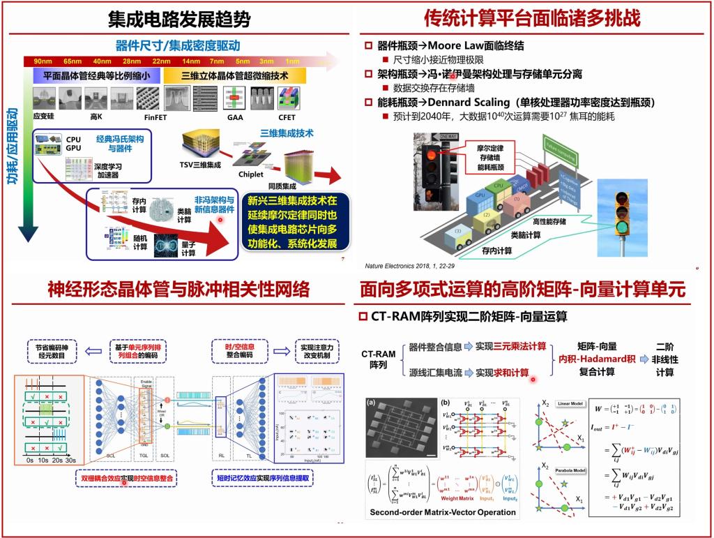 在本次学术活动中,蔡一茂教授以“基于新型神经形态器件的类脑神经网络与芯片技术”为主题进行讲座,指出类脑计算是突破冯诺依曼架构瓶颈的重要新型计算范式,是未来芯片技术中的重要技术途径,其中基于忆阻器、神经形态晶体管等新型神经形态器件实现仿生类脑架构具有很大的潜力,器件是硬件系统的基础。但是现在各种类型的神经形态器件仍然无法统一,给集成和设计都带来巨大挑战。本报告借鉴CMOS集成电路中相对统一的MOSFET基础器件这一重要优势,提出了多端新型神经形态器件的设计思路及其在类脑神经网络芯片中的应用,并探讨了针对这些新型神经形态器件的器件、算法的协同设计。