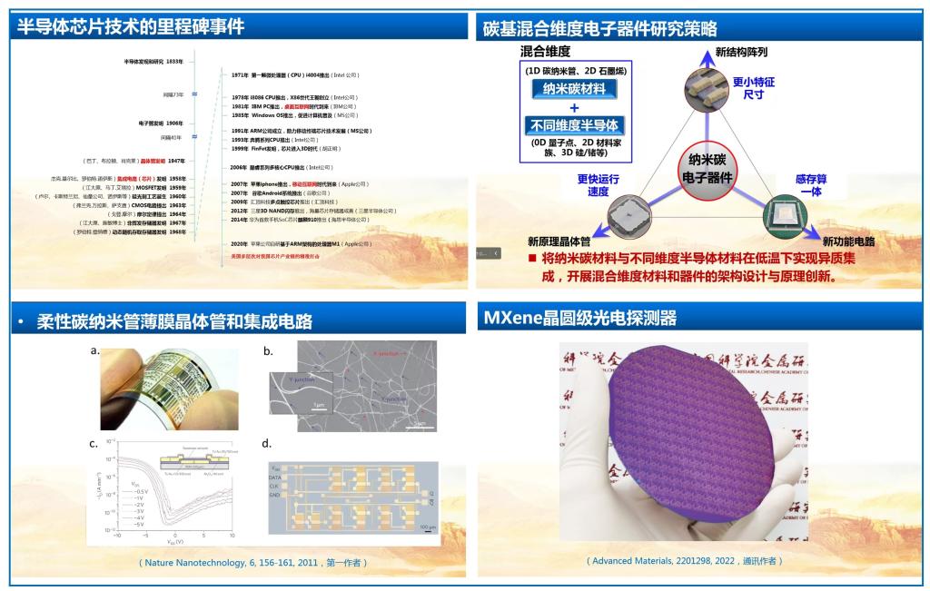 在本次学术活动中,孙东明研究员就“低维碳基电子器件”展开讲座,主要介绍了近几年来在纳米碳等低维材料半导体器件方面的研究进展:(1)基于纳米碳等低维材料的新原理晶体管:构建了垂直异质结构的硅-石墨烯-锗晶体管、二维异质结多功能整流器件、双异质结超灵敏光电晶体管,将石墨烯材料与混合维度半导体材料结合,实现了具有THz应用潜力的高速晶体管,为新型纳电子器件的设计与开发提供了新路径。(2)基于纳米碳等低维材料的新结构阵列:采用自下而上的低维材料合成技术和自上而下的微纳加工技术相结合的策略,构筑出亚纳米尺度的单原子层沟道的鳍式晶体管(FinFET)及阵列、梯度氧分布的石墨烯阻变存储器(RRAM)以及具有特殊碳焊结构的碳纳米管薄膜,尝试了后摩尔时代器件的新结构设计。(3)基于纳米碳等低维材料的新功能电路:充分发挥碳纳米材料独特的结构特征和优异的理化性质,面向柔性可穿戴电子器件的多功能集成、柔性化的重要需求,实现了碳纳米管柔性光电感存一体器件、柔性碳纳米管神经形态视觉芯片、柔性碳基显示与存储电路,构筑了兼具高集成度、超灵敏性的感存算一体功能原型芯片。