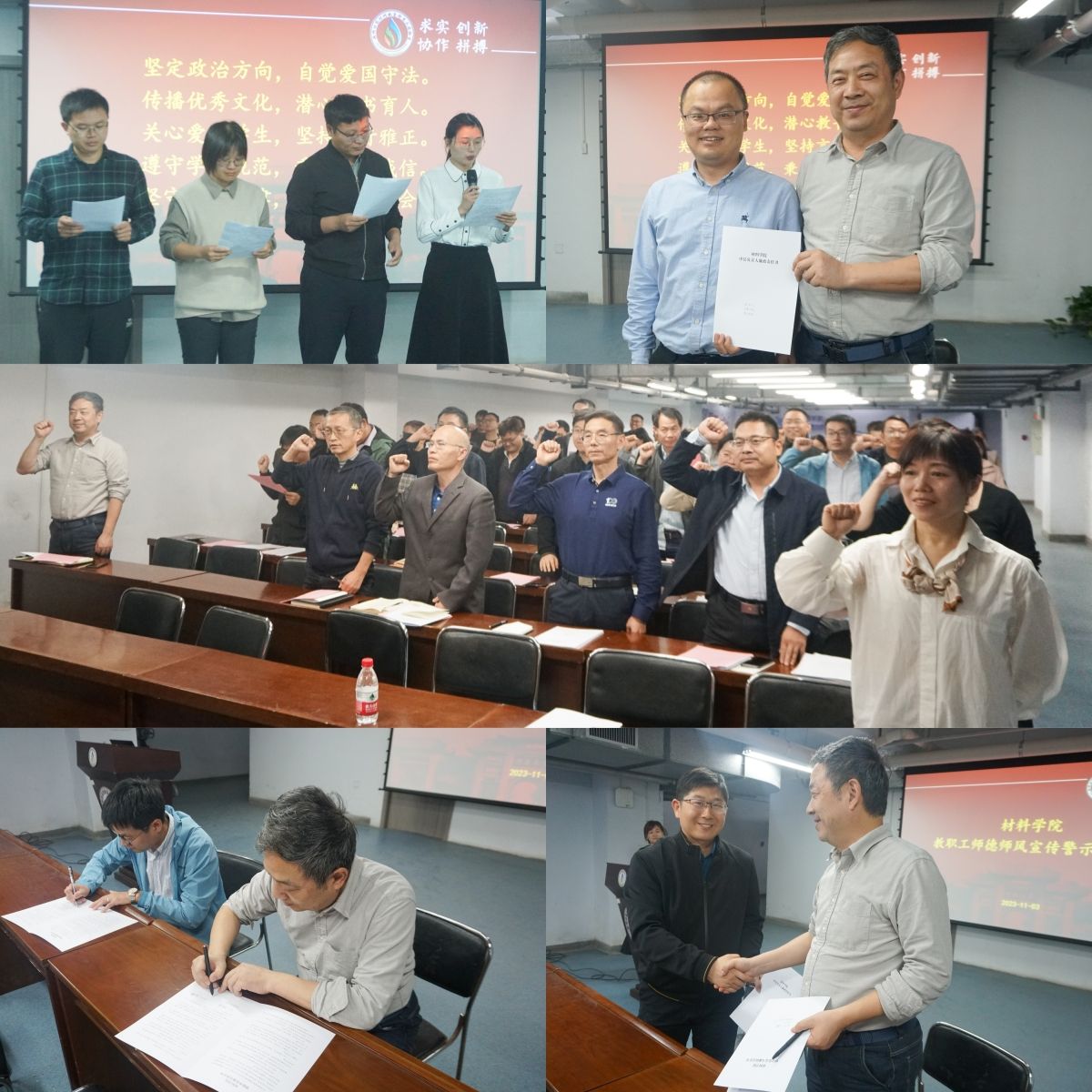 随后,全院教师在青年教师樊华华、焦世龙、魏冕、王高阳的带领下庄严宣誓,在认真对照自查后填写了《师德师风负面清单自查表》,阅读并签署了师德师风承诺书。学院中层代表与学院党委书记张霖签署了廉政责任书。大家纷纷表示,将时刻铭记自己的誓言,认真履行好教师的神圣职责和时代赋予的重任,为学生树立良好的榜样,为学院的发展贡献自己的力量。