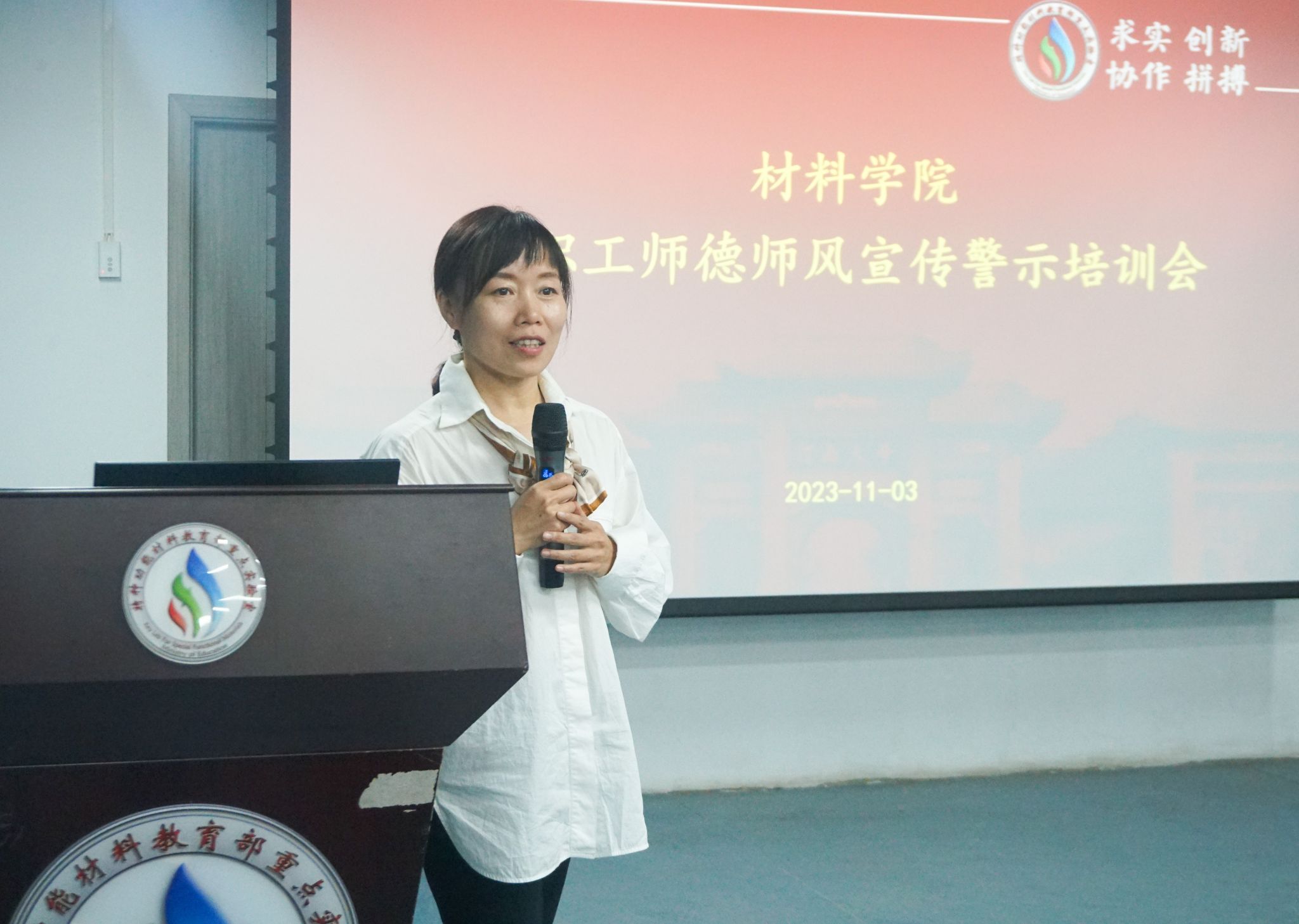 为切实加强师德师风建设,引导教职工坚定理想信念、潜心教书育人,树立良好师德形象,11月3日下午,材料学院在负一楼会议室举办了师德师风宣传警示培训会,校党委教师工作部副部长赵炎应邀做专题讲座。会议由学院党委副书记石宇珺主持。