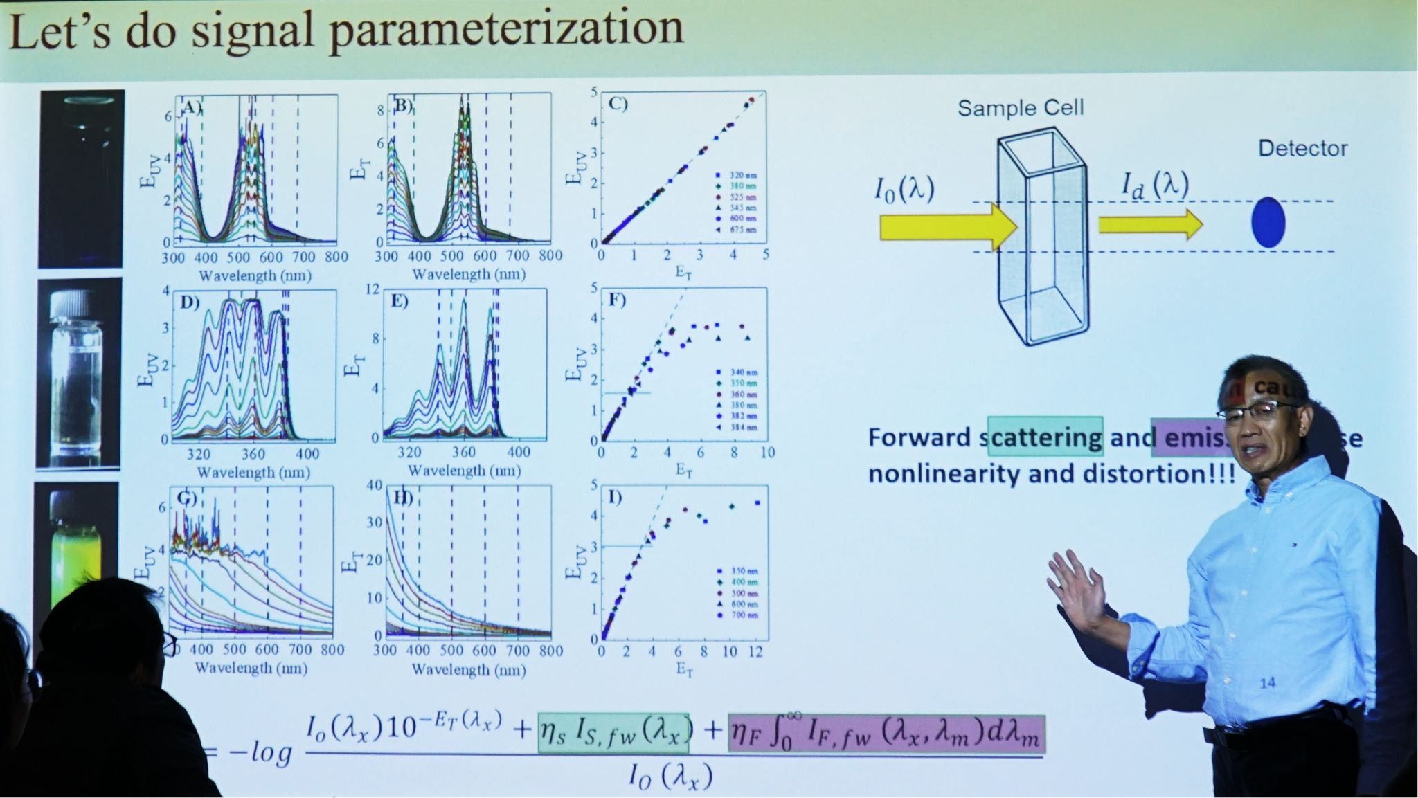 张栋茂教授作了题为“Challenges and Recent Progresses in UV-Vis and Fluorescence Spectroscopic Analyses”的学术报告。报告会上,张老师讲解了UV-Vis和荧光光谱已成为各个领域的重要工具,为材料组成、动力学转换和光学特性提供了宝贵的信息。然而,流行的光谱解释和分析经常表现出模糊性和错误,特别是对纳米级、较大的材料以及高浓度的样品而言,散射光就必须要考虑。张老师团队开发了修订后的第一原理模型,用于将实验荧光强度与包含散射体和吸收体的溶液中的样品吸光度相关联。通过使用积分球辅助共振同步光谱、线偏振共振同步光谱、紫外可见光谱和荧光光谱,并以曙红Y(EOY)、EOY与普通聚苯乙烯纳米粒子(PSNP)混合、EOY与染色的PSNP混合、荧光PSNP为例,系统地研究了前向散射和发射光子的干扰可能会导致紫外-可见光消光测量中的非线性和光谱失真。非荧光发色团的样品吸收会降低荧光强度,而散射对荧光团荧光的影响因多种竞争因素而变得复杂。张老师提出了光谱仪器和测量策略未来发展的潜在途径,旨在进一步增强光谱学在光学复杂性超过现有工具的样品纳米研究中的效用,进而增强研究人员、教育工作者和从业人员对光线相互作用的理解,并从其光谱数据中提取更可靠和有意义的信息。这项基础性和开创性的技术也将在自组装过程跟踪分析、量子点发光效率、薄膜太阳能电池、光催化等领域具有重要的应用前景,也将为工业生产和技术分析提供重要的技术参考。
