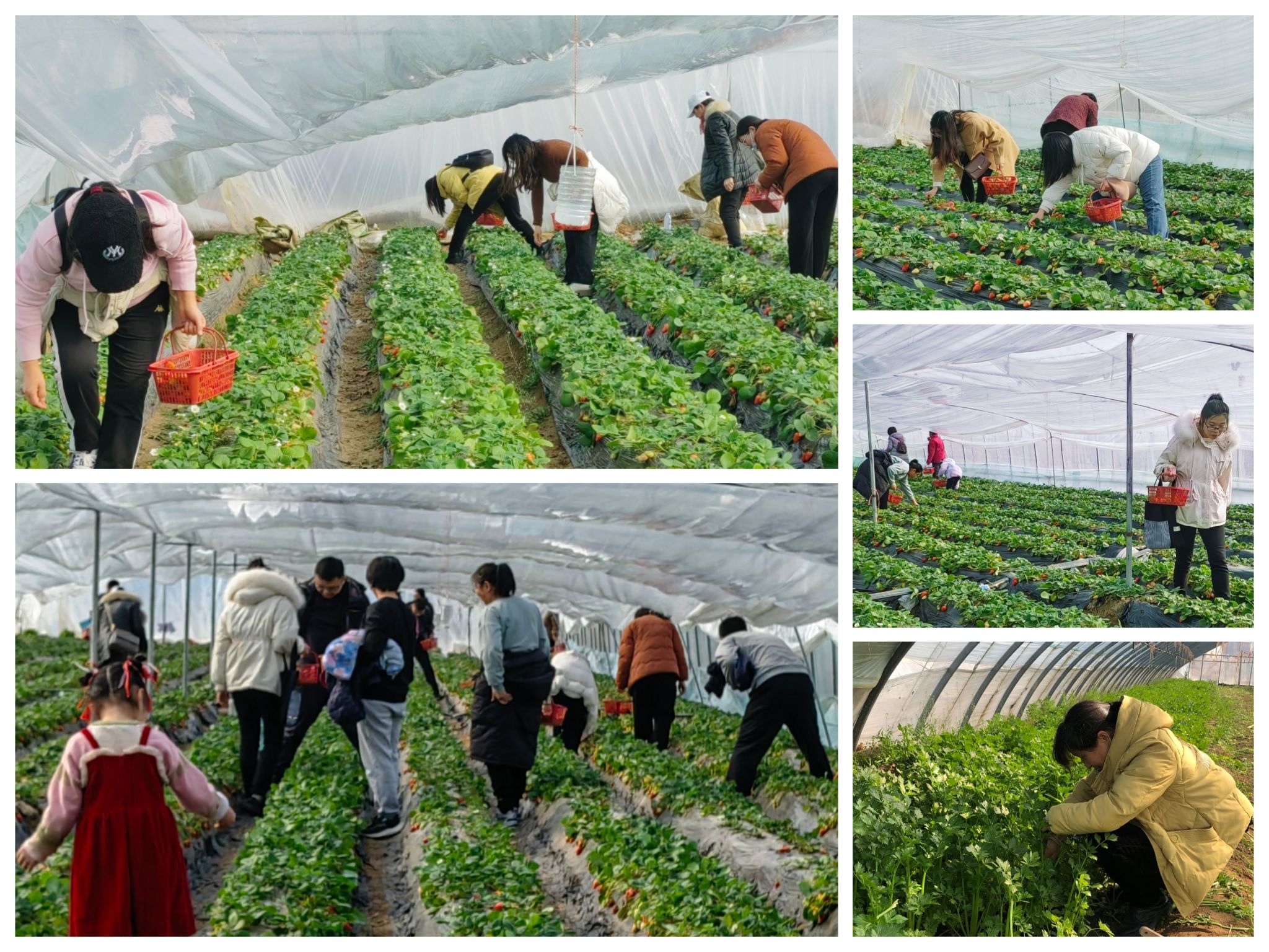 3月9日上午,在杏花营农场,春天的气息已经散布在田间地头,大家带着孩子和家人享受着难得的闲暇。原本静悄悄的草莓采摘大棚顿时热闹起来,老师们提着篮子鱼贯而入或探下身子仔细的挑选着中意的草莓,或相互交流挑选心得品尝收获,小朋友们在草莓丛中欢呼雀跃寻找“新大陆”,一颗颗红艳艳的草莓也似乎急着探出脑袋等待着大家的青睐,不知不觉篮子装满。随后,大家来到蔬菜大棚,绿油油的芹菜和生菜生机盎然的列队欢迎。在田间,老师们教孩子识别野菜,大家一起动手采摘春天的第一口鲜---荠荠菜。最后,老师们在采摘园附近进行了“爱护环境,清洁有我”的文明志愿服务活动,为周边的整洁卫生贡献爱心。欢声笑语中大家带着收获返程。