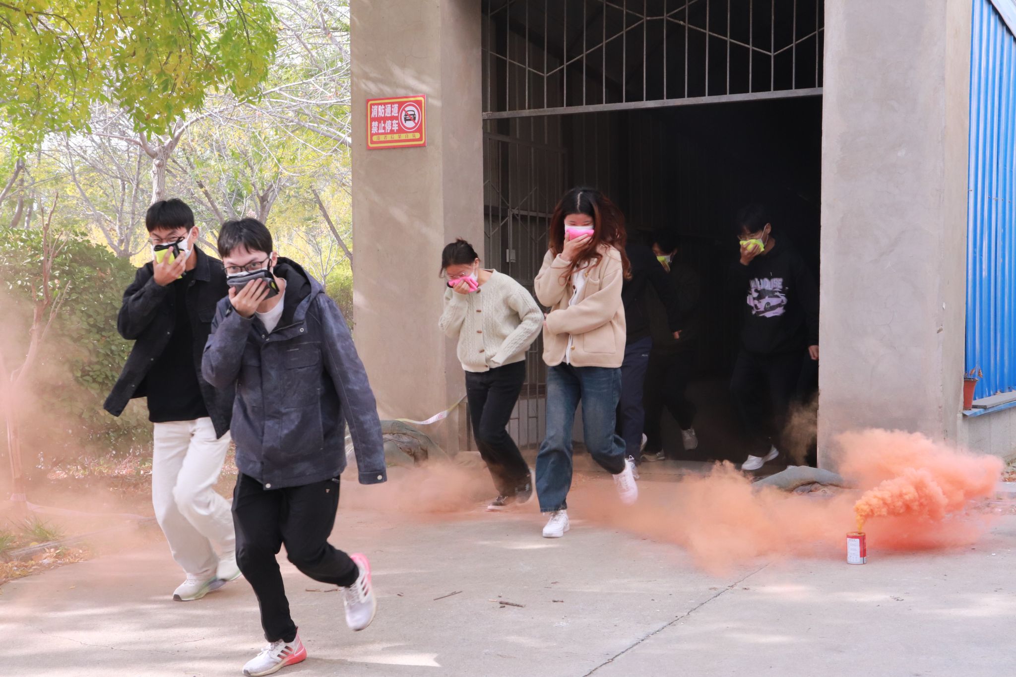 培训结束后,参训人员在负责老师的指引下,开展了疏散和消防演训活动。随着消防演习烟雾弹的燃放,大家按照预定路线,保持避险姿势,用毛巾捂住口鼻,紧张而有序的疏散,在最短的时间内全部撤离到安全区域。