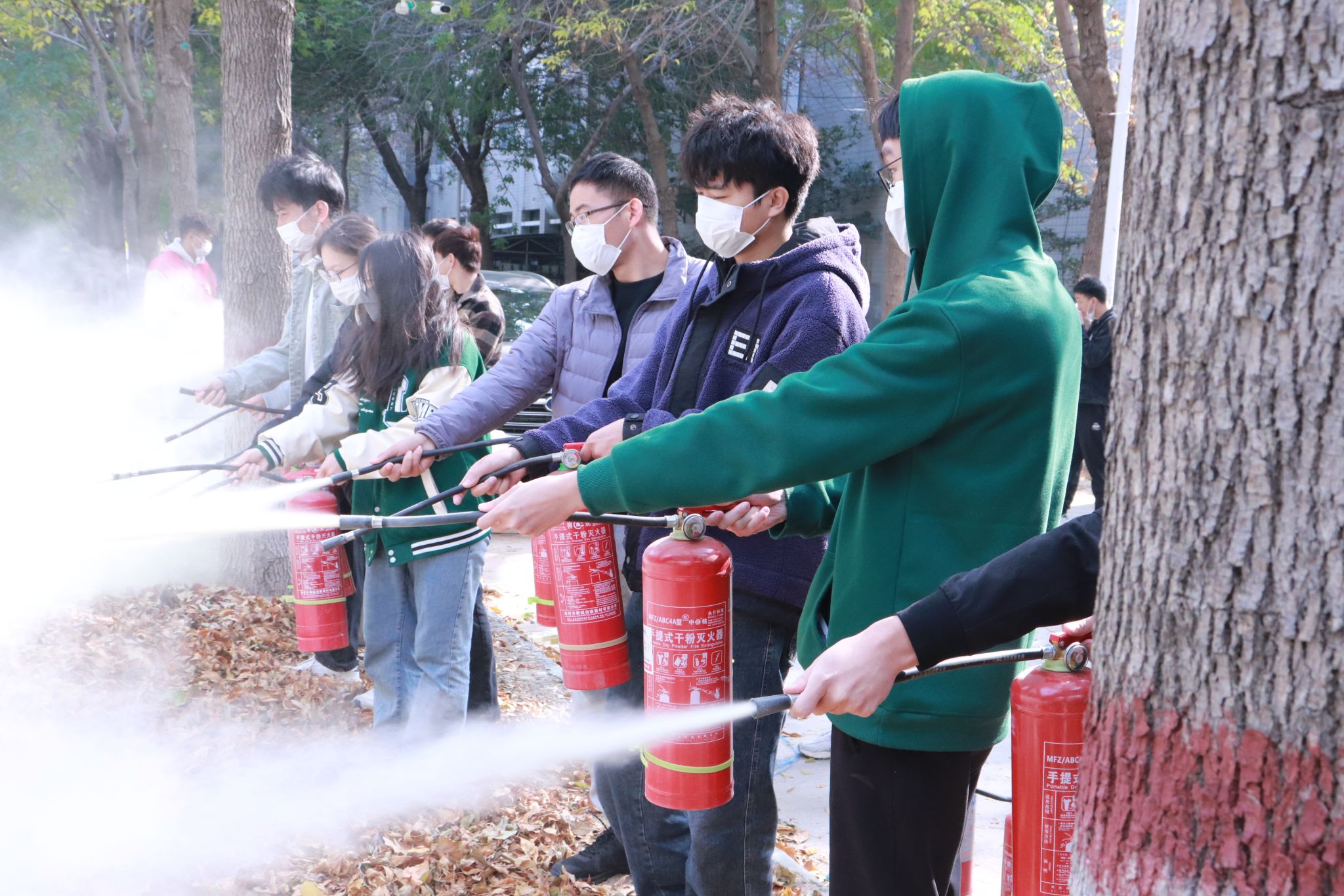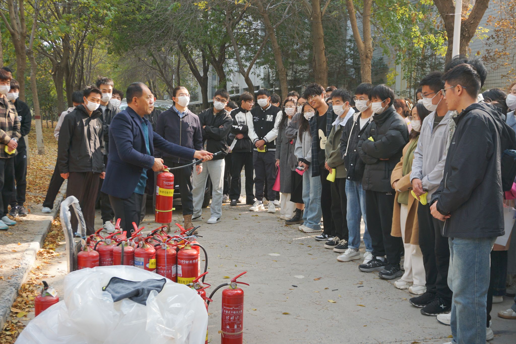 为进一步巩固演练效果,张杰在室外安全区域向在场人员讲解了灭火器和消防水带的实际使用方法。参训师生在保证安全的情况下,近距离体验并实际操作了灭火栓与灭火器,现场学习氛围浓厚,达到了预期培训的效果。
