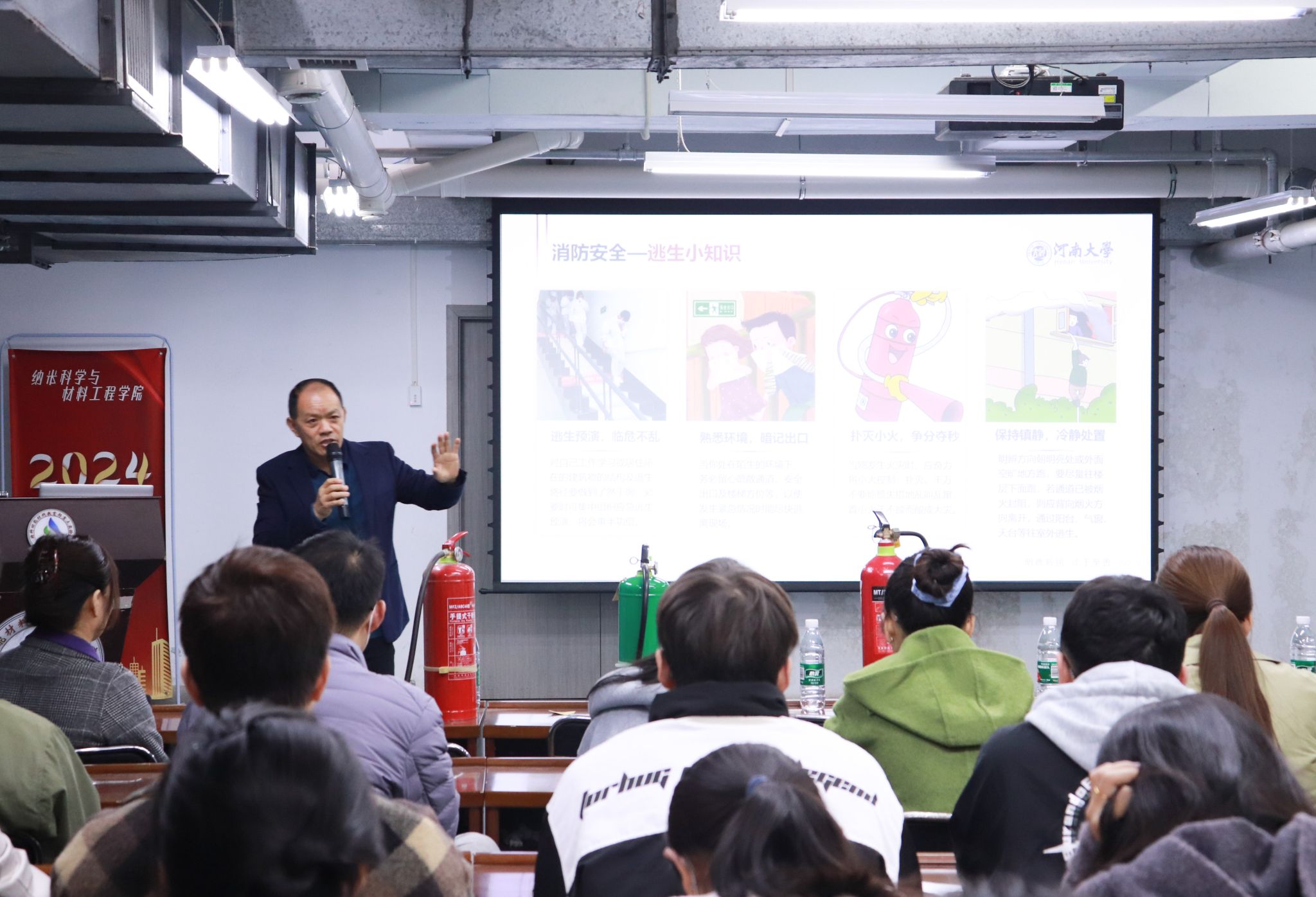 邀请保卫处副处长张杰、消防科副科长刘川申在负一楼会议室开展2024年消防知识培训暨应急演练活动,学院副院长刘谨及24级全体研究生150余人参加了此次活动。
