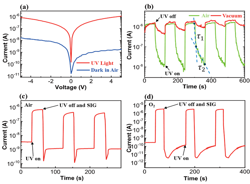 图2. (a) ZnO纳米线肖特基势垒在暗态和紫外光照下的电流-电压曲线;(b)不同气氛下的ZnO纳米线肖特基势垒的光电流开关曲线;(c)、(d):表面离子栅调控下空气、纯氧气氛下ZnO纳米线肖特基势垒的光电流开关曲线。