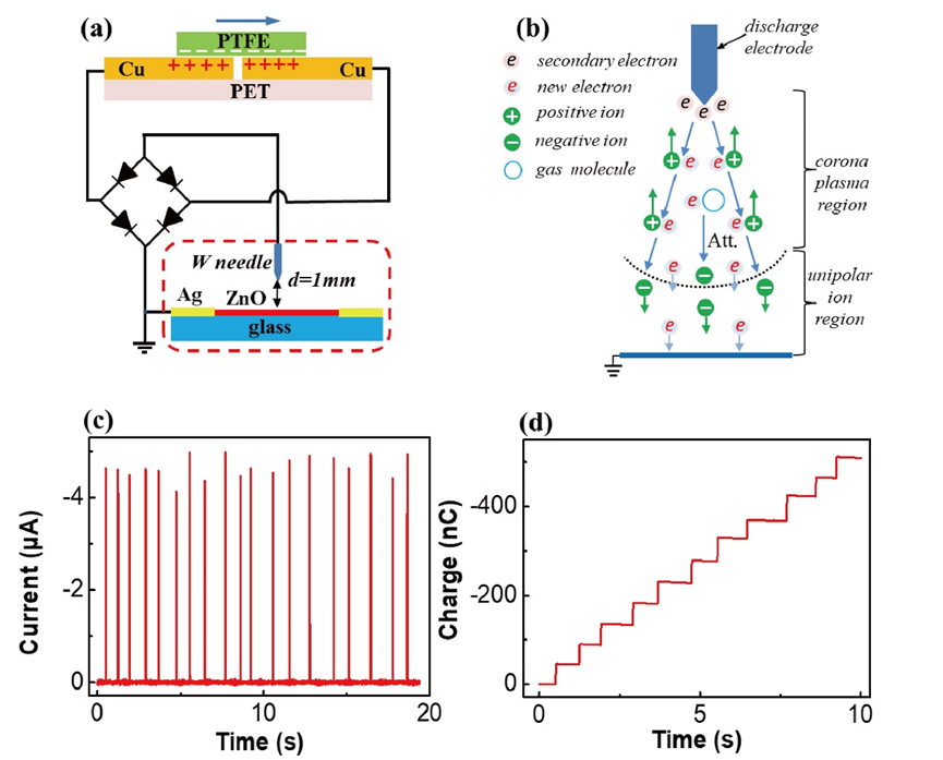 图1. (a)基于摩擦纳米发电机诱导的气体放电的表面离子栅调控技术示意图;(b)负电晕放电离子运动示意图;(c)摩擦纳米发电机诱导的气体放电的电流时间曲线;(d)转移电荷量曲线。