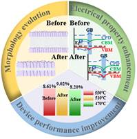CZTS薄膜光伏器件通常在550oC硒化温度下制备大晶粒吸收层,但这也伴随着较厚MoSe2层的产生、吸收层与钼基底间失配度过大、Sn流失以及元素梯度不易保持等问题,不利于将来的商业化应用。探索高效的低温硒化技术,解决低温制备薄膜结晶性差、结构缺陷多以及晶界复合严重等问题,是降低硒化温度制备高性能器件的关键。武四新教授课题组通过在前驱体溶液中引入助溶剂Sb,显著提升了薄膜结晶形貌及电学性能。最终,由于晶界电势的增强,电荷分离及载流子复合过程显著改善,在470oC的硒化温度下获得了与高温硒化相当的器件性能。该研究成果从降低硒化温度的研究视角出发,为未来低成本高效CZTS薄膜光伏器件的发展提供了有益的参考和启示。