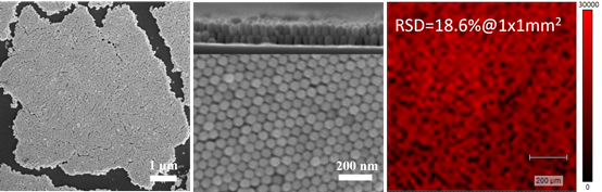 溶液挥发时溶质在液滴边缘的无序沉积被称为“咖啡环效应”,无论是在传统印刷业还是现代纳米器件制备研究中都是阻碍产品质量提升的重要障碍。通过建立环境控制的自组装过程,成功抑制了挥发过程中因热损失和质量损失导致的“咖啡环效应”,制备了器件级(mm2)规模的金纳米棒规整自组装阵列。基于该阵列的表面增强拉曼散射(SERS)对有机小分子的检测限低至1 fM(10-15M),并在1mm2范围内SERS信号强度波动相对标准偏差(RSD)仅为18.6%,显示了该阵列优异的SERS灵敏性与稳定性。该方法为各向异性纳米材料的大规模有序阵列制备提供了一个通用的方案。