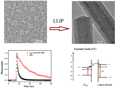 该工作利用液液界面法在位生长表面由CdSe/CdS/ZnS量子点吸附的C60棒,并讨论了该量子点与C60之间的相互作用。在复合体系中,观察到荧光猝灭,荧光寿命降低,光伏增强和光电流产生。在此基础上,研究了复合体系中CdSe/CdS/ZnS量子点与C60棒的光诱导电子隧穿转移过程,并讨论了隧穿的物理机制。