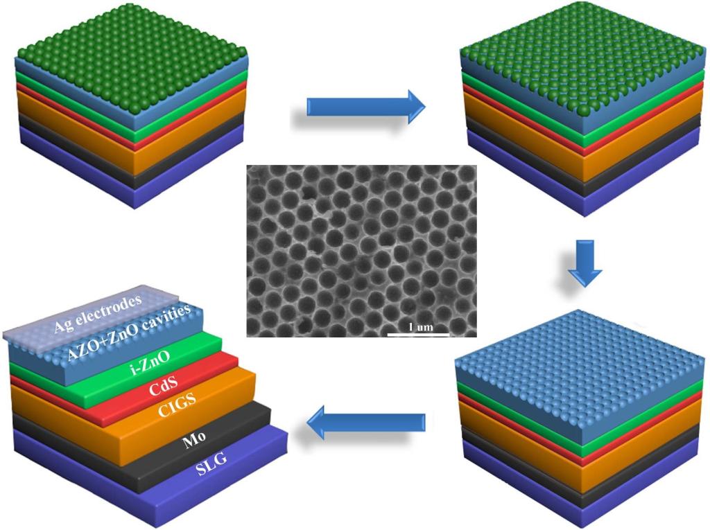 该工作利用胶体球模板技术并结合水热生长技术大面积构筑了高度有序的ZnO空腔结构,对有序ZnO空腔结构的生长机制进行了详细的研究;在此基础上,将此高度有序的ZnO空腔结构引入到铜铟镓硒(CIGS)薄膜光伏器件中,利用高度有序ZnO空腔结构独特的光学特性实现了CIGS薄膜光伏器件的光吸收增强,在ZnO空腔结构的增效作用下,CIGS器件的光电转换效率达到11.4%,其短路电流密度(Jsc)增强了9%,光电转换效率增强了10.6%。更重要的是,这种有序ZnO空腔结构除了可以有效增加器件的光吸收效率外,还显现出良好的广角吸收特性,该特性可有效保证在任意入射光角度下,器件都能保持良好的光吸收能力。该研究成果为发展全天候高效CIGS薄膜光伏器件提供了一种新的研究思路和方法。