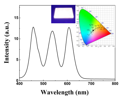 我们分别利用两亲性有机物小分子修饰和配体交换的方法得到两种荧光强度高、稳定性好、表面带大量相反电荷的水相量子点。并在此基础上,采用层层自组装技术,分别得到红色、绿色、蓝色全量子点发光薄膜,该全量子点薄膜避免了聚合物层对量子点发光性能的影响,结构高度均匀有序、光热稳定性高、发光强度和颜色精确可控。通过精确调节三种颜色比例,得到多色以及白色发光薄膜。该薄膜的荧光强度随组装层数n线性增强,具有较高的可见光透过率,且白色薄膜色坐标为(0.3292, 0.3418), 属于高质量白光光源。该发光薄膜在新型生物传感器、多色显示器、智能响应和光电子器件有潜在的应用。
