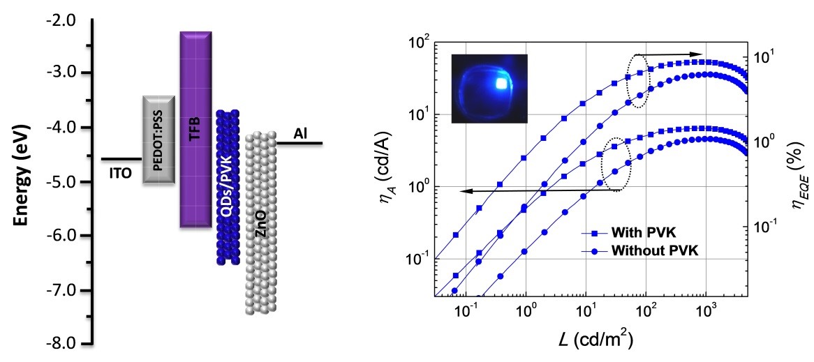 近日,李林松课题组报道了利用在ZnCdSe 核壳量子点(QDs)中掺杂polyvinyl(N-carbazole) (PVK)作为发光层的方法构筑高性能天蓝QD-LEDs,这些结果对加快QD-LEDs的商业应用具有重大意义。该研究成果发表在Organic Electronics (2016 37 280-286, SCI 二区,IF=3.471)上。 //www.sciencedirect.com/science/article/pii/S1566119916302890