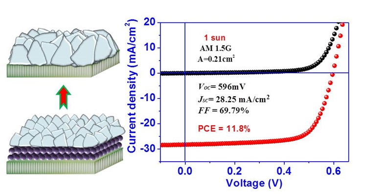 武四新课题组在前期工作的基础上,通过改进硒化方式和硒化条件,成功去除了Cu(In,Ga)(S,Se)2中的小粒子层,获得了大晶粒贯穿的吸收层,从而降低了薄膜太阳能电池的串联电阻,并获得了11.8%的光电转换效率,且具有较好的重现性。该研究成果发表在Journal of Materials Chemistry A,2016, 4, 13476-13481 (SCI一区,IF=8.262 )。文章链接://pubs.rsc.org/en/content/articlelanding/2016/ta/c6ta05728d#!divAbstract