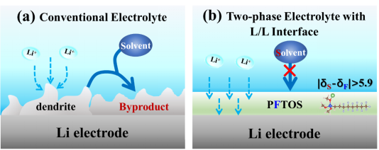 图 (a):传统电解液体系中锂电极的腐蚀和枝晶生长;(b):液/液界面两相电解液体系抑制锂电极的腐蚀和枝晶生长,增强锂电极的稳定性。