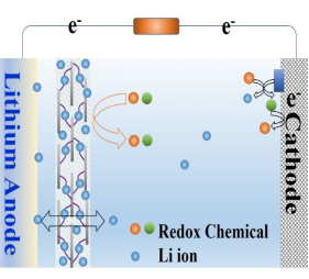 图:高锂离子含量隔膜阻隔氧化还原分子在正负极穿梭的示意图